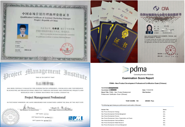 可考取证书包括:《中国市场营销经理助理资格证书》、《全国市场调查与分析专业技能证书》、《PMP项目管理专业人士资格》、《NPDP产品经理国际资格认证》等。98%的在校生考取了《中国市场营销经理助理证书》、82.5%的在校生考取了《全国市场调查与分析专业技能证书》。